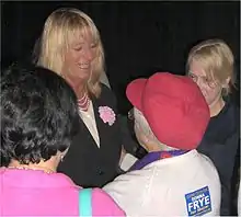Frye ran for mayor of San Diego in the November 2004 run-off election between Dick Murphy and Ron Roberts as a write-in candidate, without having run in the primary. A plurality of voters wrote in her name, but a controversy arose when she lost the election because a number of voters did not fill in the bubble next to her written name or misspelled her name (usually spelling her last name "Fry"). If those votes had counted, Frye would have had more votes than either of the moderate Republican candidates officially in the runoff, but still far below a majority vote.[4] Whether Frye would have been allowed to serve as mayor in any case is uncertain, as her write-in candidacy was at odds with the San Diego City Charter.[5]