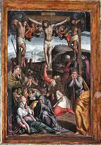 He worked chiefly at Assisi. For the church of San Crispolto of Bettona, he painted an Adoration of the Shepherds (1543), now at the Pinacoteca Civica of the town. For the Ciccoli family chapel at the church of San Francesco in Bevagna, he painted a Madonna and Child (ca. 1565), now in the city picture gallery. In Foligno, he painted a fresco depicting the Nativity with St Lucy (1544) for the monastery of Sant' Anna, a frieze for the Sala Papale of Palazzo Trinci (attributed, ca. 1545), a fresco depicting the Martyrdom of St Catherine of Alexandria for the nunnery of Santa Caterina Vecchia, now detached and in the Pinacoteca Civica. In Gubbio, he painted a Pietà (after 1560) and a Road to Calvary (ca. 1564) now in the Duomo.[3] He also worked with Lattanzio Pagani and Cristofano Gherardi at the no longer-extant Rocca Paolina of Perugia.