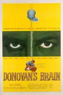 Donovan's Brain is an independently made 1953 black-and-white science fiction horror film, produced by Allan Dowling and Tom Gries, directed by Felix E. Feist, that stars Lew Ayres and Nancy Davis.[1][2] The film was distributed by United Artists and is based on the 1942 horror novel Donovan's Brain by Curt Siodmak.[3][4]
