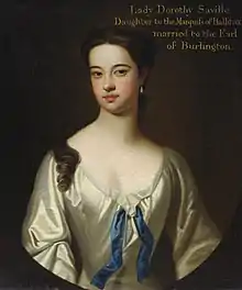 ![]() Michael Dahl, Lady Dorothy Savile, Countess of Burlington and Countess of Cork, oil painting, 1720, Hardwick Hall, National Trust.[lower-alpha 1] | |