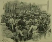 Kirwan had moved to Demerara by 1807 and initially was known by that surname, but after 1808, she insisted on being called Mrs. Thomas. She set up a rooming house near Werk-en-rust, a plantation on the southern edge of Georgetown.[18] Within a year, she moved to the northern edge of Georgetown, to a new neighbourhood known as Cumingsburg, a fashionable and growing area adjacent to the plantation owned by Thomas Cuming. She bought several lots there and paid taxes in 1808 for 16 slaves. Notices in the Demerara Gazette indicate that she offered lodging and employed her slaves as hucksters.[22] The closed plantation system, under which the estate provided for all the needs of its inhabitants, had ceased to exist when the British began occupying the colony at the end of the 18th century. Instead, plantation owners' orders for goods, typically made once or twice a year, were supplemented by provisions brought by travelling peddlers.[23] As the inhabitants were thinly spread across the colony, shops were impractical, and hucksters were an essential part of the society.[24]