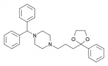 Dotarizine is a drug used in the treatment of migraine,[1] which acts as a calcium channel blocker,[2] and also as an antagonist at the 5HT2A receptor, and to a lesser extent at the 5HT1A and 5HT2C receptors.[3][4] The anti-migraine action is thought to be due to its action as a vasodilator,[5][6] but it also has some anxiolytic effects[7] and blocks amnesia produced by electroconvulsive shock in animals.[8]