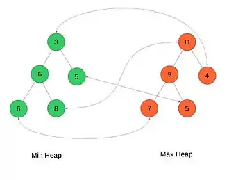 - Removing the min element: Perform removemin() on the min heap and remove(node value) on the max heap, where node value is the value in the corresponding node in the max heap.