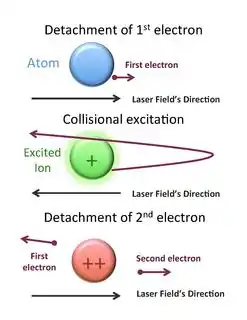 For noble gas atoms, non-sequential double ionization was first observed by L'Huillier.[9][10]  The interest to this phenomenon grew rapidly after it was rediscovered[11][12] in infrared fields and for higher intensities. Multiple ionization has also been observed.[13][14]  The mechanism of non-sequential double ionization in noble gas atoms differs from the one in alkaline earth atoms. For noble gas atoms in infrared laser fields, following one-electron ionization, the liberated electron can recollide with the parent ion.[15][16] This electron acts as an "atomic antenna",[16] absorbing the energy from the laser field between ionization and recollision and depositing it into the parent ion. Inelastic scattering on the parent ion results in further collisional excitation and/or ionization. This mechanism is known as the three-step model of non-sequential double ionization, which is also closely related to the three step model of high harmonic generation.