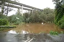 At this location also are the Douglas Park twin bridges, carrying northbound and southbound lanes of the F5 Freeway over the Nepean River. This bridge was opened in 1980, as part of the extension of the Hume Highway from Campbelltown to Yanderra.[18] In 2007, Douglas Park residents expressed concern that coal-mining in the area would cause the collapse of either or both of these bridges, possibly resulting in many deaths.[19]
