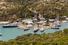 The hill overlooks English Harbour and offers views of the first European settlements on Antigua, established in the early 17th century, and of the fortifications surrounding Nelson's Dockyard.[1] The hill formed part of the estate of Archibald Dow, the civilian storekeeper at the dockyard, who constructed a house there in 1732. The land was compulsorily acquired from Dow in 1789 at a cost of £8,354 0s 8d to allow fortifications to be constructed to protect the ridgeline from attack from the landward side. The fortifications were built by the Royal Engineers and included stone walls intended to make the fortifications appear more imposing to potential attackers than they actually were. Dow's house was used by senior officers of the garrison before being converted to a residence for the Governor of the Leeward Islands. This was destroyed in an earthquake of 1834, which also ended the permanent presence of a garrison on the site.[2]