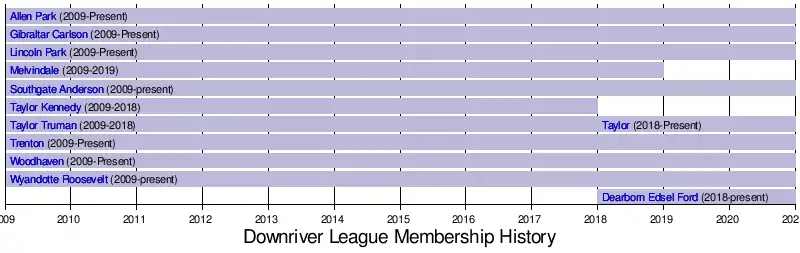 The Downriver League is an athletic conference for high schools in Michigan. It was formed in 2009 after the dissolution of the Michigan Mega Conference by schools in the "Downriver" area of Metro Detroit. In 2018, Dearborn Edsel Ford was brought into the league to the fill the opening left by Taylor Kennedy after it closed and consolidated with Taylor Truman to make Taylor High. In 2019, Melvindale left to join the Western Wayne Athletic Conference.