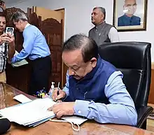 Harsh Vardhan (born Harshvardhan Goel,[1] 13 December 1954) is an Indian otorhinolaryngologist. He had served as the Minister of Health and Family Welfare, Minister of Science and Technology and Minister of Earth Sciences in the BJP-led NDA government of Prime Minister Narendra Modi from 30 May 2019 to 7 July 2021. He represents Chandni Chowk in Delhi as a Member of Parliament in the 17th Lok Sabha. He was elected to the office of Chairperson of Executive Board of the World Health Organization from May 22, 2020.[2] Vardhan has been prominent in the Indian government's response to the COVID-19 pandemic.[3] He later resigned from his cabinet post ahead of the cabinet reshuffle in July 2021.