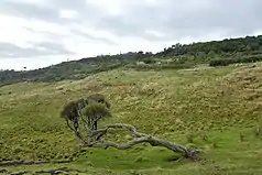 The Chatham Islands are extremely windswept, receiving an average annual wind speed of 24 km/h (13 kn) as well as having record wind speeds of 157 km/h (85 kn) in January 1993 and 124 km/h (67 kn) just a few months later.[15] To adapt to this D. arboreum has evolved to be heteroblastic, developing large leaves as juveniles which become thin, wind-resistant needles as they gain maturity. Many species in mainland New Zealand are heteroblastic as well, such as the lancewood, but probably because of large, now extinct, browsing birds such as the moa.[16] The Chatham Islands have never had these which means D. arboreum has likely evolved in this way due to climatic factors such as the wind; the thinner leaves reducing stress on the stalks.[17][18]