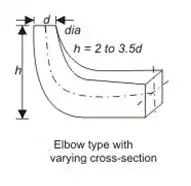 2. Simple elbow type draft Tube-It consists of an extended elbow type tube. Generally, used when turbine has to be placed close to the tail-race. It helps to cut down the cost of excavation and the exit diameter should be as large as possible to recover kinetic energy at the outlet of runner. Efficiency of this kind of draft tube is less almost 60%