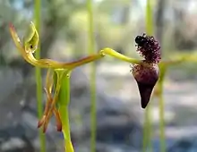 Drakaea elastica is similar to others in the genus in that it has a single, ground hugging leaf and an underground tuber. In this case, the leaf is heart shaped, about 20 millimetres (0.8 in) in diameter, glabrous, light green and glossy. The leaf veins are slightly darker in colour. Leaves appear in July or August but by the time the flower has opened, the leaf is often withered.[1] The stem is 12–30 centimetres (4.7–12 in) long and the stalk of the single flower is 10–12 millimetres (0.4–0.5 in) long.[2]