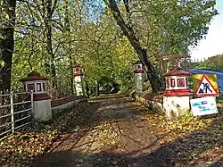 Doggartland House at Drakemyre may derive its name from 'Dogger' which is Scots for a course ironstone, much mined in the area as witnessed by waste bings below Ryefield and at Flashwood. An impressive, but now largely redundant cast iron bridge crosses the Rye Water within the grounds of Doggartland House. This bridge has very elaborate cast-iron balustrades and the nearby house has been described as 'Italianate' and the driveway is guarded by two pairs of quirky gatepiers, one tall and the other small, octagonal with panels at the top (See photograph).[5]