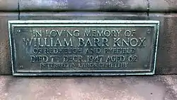 Ryefield House was described as "almost new" in 1851[5] and the estate possessed a fine 'U-shaped' stable block with a courtyard to the east of the mansion house as well as a large walled garden to the west. The mansion house is of a classical style, built of ashlar with a Doric porch and in the 1920s a single storey ballroom was added,[5] also used as an art gallery by William Barr Knox. William first married Gladys Burrell, a niece of Sir William Burrell the Scottish shipping merchant and philanthropist, made famous through the Burrell Collection. Edith Dunlop of Strathaven was the second wife of William Barr Knox, he is buried in Largs, however a commemorative plaque is also present at the Knox family memorial in Kilbirne 'Auld Kirk' cemetery where he is recorded as being of 'Redheugh and Ryefield'. His daughter was named Diana.