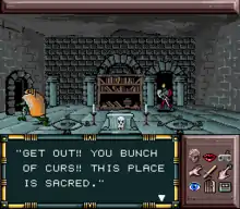 Drakkhen's gameplay is colored by its early-game brutality and surreal enemy encounters, the former especially in the SNES version. One special enemy is relegated solely to appearing when the player kicks one of the many urns in the ground. Upon doing so, a black, stationary canine head rises from beneath the floor to shoot bolts from its eyes. These encounters are quickly fatal to new players who don't know any better.[4] They offer no experience points, suggesting that kicking an urn is frowned upon. Another difficult enemy is the "Shadow Man", a tall figure that can unexpectedly lift itself out of the ground, accompanied by an ominous tune. Each enemy has movement and attack differences, some being less subtle than others, such as enemies that zigzag sporadically at a much greater speed than the player's party can keep up with. The game contains over one hundred different enemy variants.[5]