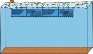 Drift netting is a fishing technique where nets, called drift nets, hang vertically in the water column without being anchored to the bottom. The nets are kept vertical in the water by floats attached to a rope along the top of the net and weights attached to another rope along the bottom of the net.[1] Drift nets generally rely on the entanglement properties of loosely affixed netting. Folds of loose netting, much like a window drapery, snag on a fish's tail and fins and wrap the fish up in loose netting as it struggles to escape. However the nets can also function as gill nets if fish are captured when their gills get stuck in the net. The size of the mesh varies depending on the fish being targeted. These nets usually target schools of pelagic fish.