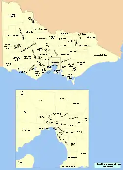 The Office of Geographic Names (OGN), led by the Registrar of Geographic Names, administers the naming or renaming of localities (as well as roads, and other features) in Victoria, and maintains the Register of Geographic Names, referred as the VICNAMES register, pursuant to the Geographic Place Names Act 1998.[1] The OGN has issued the mandatory Naming rules for places in Victoria, Statutory requirements for naming roads, features and localities – 2016 (naming rules), which took effect on 2 February 2017, and which are based on national standards and policies in naming of such places.[2] Detailed maps showing locality boundaries within a LGA are available on the Land Victoria website.[3]
