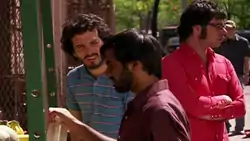 A sidewalk fruit vendor, Sinjay (Aziz Ansari), refuses Bret and Jemaine service due to the fact that they are New Zealanders. He disinfects the fruit they touch, and they leave empty handed.