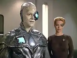 The Borg are a Star Trek villain species famous for their phrase, "resistance is futile." TV Guide named the Borg at number 4 in its 2013 list of the 60 Nastiest Villains of All Time.[2] The Borg was introduced on Star Trek: The Next Generation in the episode "Q Who?" (S2E16) and also featured in the critically acclaimed episode "The Best of Both Worlds".[3] They made a major influence on Voyager starting with "Scorpion", which introduced the ex-Borg character Seven of Nine to the main cast, and there were many Borg-centric episodes since that time; they return with a major story once again in Drone.[4]