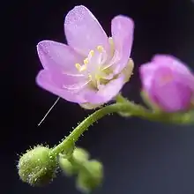 Drosera madagascariensis forms one or two slightly pubescent inflorescences which are 20–40 cm (8–15.5 in) tall and bear 4-12 flowers on 2–5 mm long peduncles. The sepals are ovate and slightly pubescent. The pink petals are obovate, 6–12 mm (0.24–0.47 in) long and 4–6 mm wide. The seed capsules are dehiscent and bear numerous seeds up to 0.6 mm long.