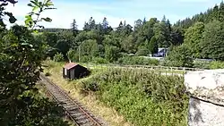 The 1899 OS map shows the single short station platform that was located on a straight section of the northern or loch side of this single track section of the branch not far from Sawmill Cottage. A road overbridge stood nearby and the lane gave direct access to the loch.[6]