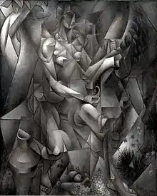 In a review of the 1910 Salon d'Automne the poet Roger Allard (1885-1961) announced the appearance of a new school of French painters who—in contrast with Les Fauves and Neo-Impressionists—concentrated their attention on form rather than on color. A group formed following the exhibition that would include Gleizes, Metzinger, Henri Le Fauconnier, Fernand Léger, and Robert Delaunay (a friend and associate of Metzinger since 1906). They convened regularly at the studio of le Fauconnier where he worked on his ambitious allegorical painting entitled L'Abondance. "In this painting" writes Brooke, "the simplification of the representational form gives way to a new complexity in which foreground and background are united and the subject of the painting obscured by a network of interlocking geometrical elements".[8] But it was Metzinger, a Montmartrois in close contact with Le Bateau-Lavoir and its habitués—including Guillaume Apollinaire, Max Jacob, Maurice Princet, Pablo Picasso and Georges Braque—who introduced to Gleizes and the others of the group, with his Nu à la cheminée (Nu), 1910, an extreme species of 'analytic' Cubism (a term that would emerge years later to describe the 1910-1911 works of Picasso and Braque).