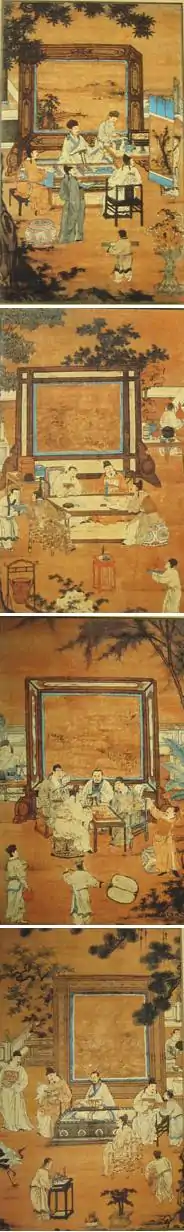 The adjoining four-part silk painting is on the traditional subject of the Four Arts of the Chinese Scholar and is called "18 Scholars"; it is in the Shanghai Museum. [2]
