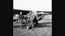 ![]() Lieutenants Duane Francies and William Martin by the small plane flown on reconnaissance missions over France and Germany. | |