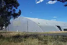 The five Igloo stores buildings type W3, 94.2 by 76.2 metres (309 ft × 250 ft), display innovative technical design in the use of prefabricated and pre-cut timber frames and trusses adapted from American designs to local materials. The sheer size of the Igloo buildings, both externally and internally, is breathtaking for the average person. They are an unusual, functional and attractive form of industrial structure that is evocative of war time design and construction practices. They are also significant in illustrating the techniques employed to camouflage such large structures.[3] They were built initially at Dubbo without roof lights due to blackout requirements. They are constructed in classic post and truss framing in an arched configuration with hardwood frames, corrugated iron sheeting and concrete floors.[7] There are five longitudinal rows of solid hardwood columns supporting transverse segmented Pratt trusses. The Pratt trusses span 15.7 metres (52 ft) between lines of columns with spaced pairs of members for top and bottom chords, single vertical compression members and spaced pairs of diagonal members. Trusses were fabricated from local hardwood with bolts and shear connectors. Gantry cranes service the two aisles of the building above a reinforced concrete floor slab. The end gables of the building were unadorned except for personnel doors. Each side of the building features a long series of offices between the main sets of access doors. There is extensive perimeter drainage to cope with the rainwater run off generated by the roof areas and latrines on one side. The buildings were carefully oriented to minimise shadowing in order to resemble hills from an aerial perspective. On completion the profiles of the openings and gables were also modified by the use of galvanised iron sheeting cut to resemble tree shapes. The five igloos at Dubbo, and a similar building, Warehouse 11 at the Macrossan Stores Depot in Queensland, are the only surviving examples of this building type in Australia.[8][1]