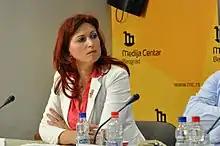 Filipovski joined New Serbia in 2004 and was appointed as a party spokesperson later in the same year.[3] She appeared on the party's electoral list for the City Assembly of Belgrade in the 2004 Serbian local elections.[4] The list did not cross the electoral threshold to win any mandates.[5] In November 2005, she was chosen as a party vice-chair.[6]