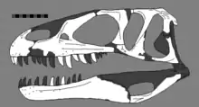 In 2005, Allain established some distinctive traits. Dubreuillosaurus has an unusually low and long skull, with a length three times the height. In the upper corner of the front edge of the nasal branch of the maxilla, a kink is present, separating a convex curvature below from a concave curvature above. The descending branch of the postorbital has a U-shaped cross-section. The parietal bones are not visible in side view. The supratemporal fenestra has a straight inner edge. A paraquadratic fenestra is lacking. A well-developed process is present on the underside of the jugal branch of the ectopterygoid. The rear edge of the jugal branch of the ectopterygoid, in front of the infratemporal fenestra, is deeply grooved. The lower jaw has a large external mandibular fenestra. The foramen mylohyoideum is largely oriented to the front and below. The head of the thighbone is directed to the inside and below. The front underside of the thighbone has a concave surface.[3] In 2012 Matthew Carrano added one autapomorphy: on the rear of the braincase there is a notch between the basioccipital and the bone surface formed by the exoccipitals and the opisthotic.[5]