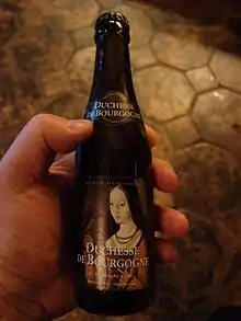 Duchesse de Bourgogne (pronounced [dy.ˈʃɛs də buʁ.ɡɔɲ]) is a Flanders red ale-style beer produced by Brouwerij Verhaeghe in Vichte, Belgium. After a primary and secondary fermentation, this ale is matured in oak barrels for 18 months. The final product is a blend of a younger 8-month-old beer with an 18-month-old beer. The name of the beer is meant to honour Duchess Mary of Burgundy, the only daughter of Charles the Bold. She was born in Brussels in 1457, and died in a horse riding accident. Like all Flemish red ales, Duchesse de Bourgogne has a characteristically sour, fruity flavour similar to that of lambic beers.