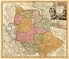 ![]() Former Bremen-Verden as of 1730 (in light pink) pasted over today's state borders (grey) and former region borders (white, as of 1977) with broken lines, indicating their changes between 1731 and 1977. At the northern tip the Land of Hadeln and Cuxhaven are excluded.[2] | |||||||||||||||||