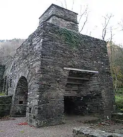 The furnace stack, of local stone, is intact to its full height of 29 feet, but the hearth has been removed. It was powered from a leat from the River Duddon and was blown (at least latterly) by blowing cylinders, described by Morton.[10] The bridge, leading to the charging platform, has rooms under it used for workers' housing. The charcoal barn is 100 feet long,[11] and the iron ore store also survives. The site was investigated archaeologically in the 1980s, but only interim reports from this have been published.[12]