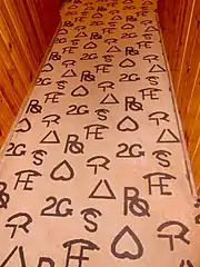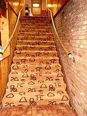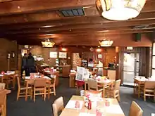 The "Stirrup Coffee Shop" restaurant was also part of the structure, and began operations in the mid 1950s.[4] Its original design also included a custom-made carpet and featured tooled oak furniture with cowhide seats and backs. It contained a soda fountain and patrons could observe food being prepared in the kitchen. Though the restaurant carpeting and some fixtures have changed, the ceiling lights with western images are original to the building, and most of the original tables and chairs are still in use. The horizontal neon sign that once graced the courtyard driveway entrance on North 29th Street was moved to the back entrance in 2000, when a second round of major remodeling occurred. The most significant change to the building occurred that year, when some of the brick on the south exterior wall was covered by board-and batten siding and a new entrance was built.[1] The new south wall, labeled the "branding wall", features actual brands from local area ranches, some applied in 2000 at the 50th anniversary celebration of the motel's opening, and others later, up through 2015.[5][6]