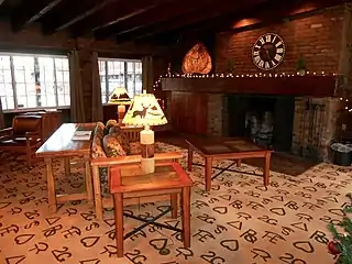 The interior, designed by Annabel with help from her daughter, had walls paneled with knotty pine and the carpets had cattle brands woven into the design. Smaller Navajo rugs were used in uncarpeted areas. Rope was used for handrails on the stairs. A small, home-like lounge in the lobby area with exposed fir ceiling joists and a fireplace completed the facility. Furniture with an "Old West" look was custom-designed for the rooms, and the original window drapes featured scenes from Montana history. The original carpet was replaced with a similar design in 1984 when a major remodeling occurred, and the closets on the north wing of the building were torn out and replaced with armoires in order to allow for the bathrooms to be remodeled, but many of the original furnishings remain, particularly on the south wing of the building.[1]