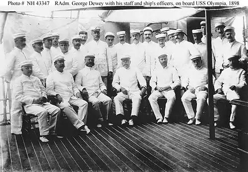 - US Navy (2004). "Photo #: NH 43347 – Rear Admiral George Dewey, Commander of the U.S. Asiatic Squadron, with officers of his flagship, USS Olympia (C-6), and his staff on board the Olympia in Manila Bay circa 20 May-1 June 1898". Naval Historical Center. US Government, U.S. Naval Historical Center Photograph. Archived from the original on September 26, 2012. Retrieved July 23, 2012. Note: Carpenter is standing third from the left.