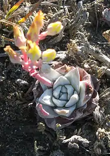 Dudleya gnoma is a rare species of succulent plant in the stonecrop family known by the common names munchkin liveforever and munchkin dudleya.[2] It is characterized by its diminutive stature, small yellow flowers, and distinctive white rosettes. It is endemic to the eastern portion of Santa Rosa Island, one of the Channel Islands of California, where it is known from one population at the type locality, containing three colonies of plants.[1]