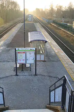 Duffield railway station serves the village of Duffield in Derbyshire, England. The station is located on the Midland Main Line from Derby to Leeds, 133 miles 8 chains (214.2 km) north of London St Pancras. It is also a junction with the former branch line to Wirksworth, which has now been reopened as the Ecclesbourne Valley heritage railway.