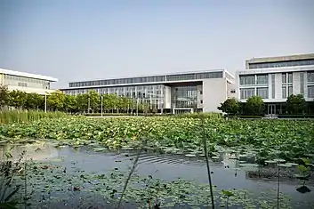 The campus blends traditional Chinese elements with advanced educational technology in a spacious, modern setting. Extensive aquatic elements, including an aquatic quadrangle at the center of campus, symbolize the region's famous water towns and are integrated throughout the campus, while information technology and Telepresence systems provide connections to colleagues and classmates around the world. The site has a high water table, so designers elected to preserve 40 acres as community gardens.[26]