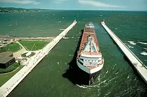 In its current configuration, the canal is defined by a pair of breakwaters 1,720 feet (520 m) long and 300 feet (91 m) apart, constructed of concrete set on timber and stone cribbing.[1] The canal is maintained at 245 feet (75 m) wide and 28 feet (8.5 m) LWD, allowing passage of ocean-going ships.[2] Three lighthouses are placed on the sides of the canal: the Duluth North Pier Light and the Duluth South Breakwater Outer Light mark the lake ends of the canal, while the Duluth South Breakwater Inner Light functions with the south breakwater light as a range light. At the harbor end, the canal is straddled by the Aerial Lift Bridge which connects Minnesota Point to the rest of the city. On the north side, there is a building housing the local Corps of Engineers administration, as well as the Lake Superior Maritime Visitor Center. There are no locks; most ships transit the canal under their own power, though tug service is available in case of adverse weather.[3] Around a thousand vessels a year ship from the Duluth–Superior port.[4]