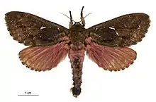 The wingspan is 51–67 mm for males and 74–90 mm for females. The colour pattern of the forewings is complex in males and usually reduced or obsolete in female. The hindwings are unicolorous yellow, orange-yellow or pink.[4] The bright colouration of the hindwing of the male of the species fades rapidly after death.[5]