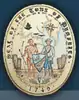 The two water fowl relate to the wetlands of Quantico Creek. The dock with fishnet, pilings, ships block and line further the theme of a mercantile port of call. The thistle indicates the Scottish founders of the town, with the name of Dumfries, taken by John Graham, the founder, in honor of his home in Scotland. The supporters of the shield are, on the left, a Piscataway brave, of the Powhatan Confederacy, the predominant tribe along the Potomac, in this area. On the right, a Colonial militiaman of 1775, when Colonel Henry Lee was company Commander. The shield in its upper quadrant, displays a sailing vessel of the period, and below the tobacco leaf, the first commodity, overlaid with shafts of wheat, the later commodity that supported the town.