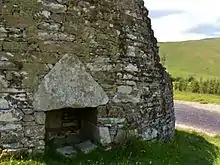 The broch has an external diameter of about 14.5 metres.[1] The walls of Dun Dornaigil generally survive from 2 to 3 metres around the circumference of the broch, but above the doorway they rise to nearly 7 metres.[1] The entrance is on the northeast side but is filled with debris.[1] There is a massive triangular lintel over the entrance which measures 1.4 metres along the base, and 0.9 metres in height.[1] The interior of the broch is still filled with collapsed rubble from the upper levels and is therefore not accessible.[2]