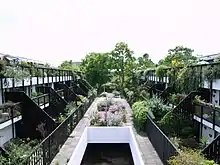 The scheme was designed by Neave Brown and the Camden Architects Department, it was the first application of the low-rise high-density housing scheme attached to public building. There were built in 1967, as an experiment where 71 houses, a shop, and a studio, were arranged in parallel terraced rows, in groups of eight or sixteen, following the split level principles that Brown had used in his small housing scheme in Winscombe Street. Each house had a large terrace which overlooked the communal gardens.[3]
