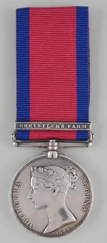 In 1848, the Military General Service Medal was created with a clasp for Crysler's Farm and the following men were awarded the medal for service with the Dundas Militia:[3]