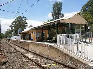 The station building is a reconstruction of the original timber narrow awning building (type 8). It is a painted timber building with a hip and gabled galvanised iron roof, and a skillion extension on the Carlingford (Up) end of the building. Four entry points, a large window and a small square window are located on the platform side and are covered with security screens. These are also used on all other windows and doors and hide the timber panelled doors and four paned timber framed windows. Some of the window frames appear to be original. The Station Street elevation is characterised by one double door entry, two large windows and several high, small square windows. The Station Street entry, together with the main entry area on the other side of the building have small, cantilevered awnings with corrugated iron sheeting and decorative ends.[3]