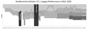 Dunfermline Football Club was formed in 1874, when members of Dunfermline Cricket Club decided to establish a football section, with the intention of maintaining fitness during the winter.[1] A dispute over club membership caused some members to split away from Dunfermline Cricket Club, which resulted in the creation of Dunfermline Athletic Football Club on 2 June 1885. The club became the principal football club in Dunfermline and their first twenty-five years saw them compete primarily as an amateur team, until they turned professional in 1899.[7] The club first entered into the Scottish Football League in 1912 where they took part in the Scottish Division Two. The fifty years following the club's admittance to the SFL saw little success, with the side most frequently playing in the second tier, with occasional appearances in the top flight.
