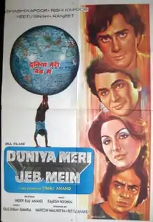 Duniya Meri Jeb Mein is a 1979 Bollywood action film directed by Tinnu Anand, stars Shashi Kapoor, Rishi Kapoor, Neetu Singh in pivotal roles and music was composed by Rajesh Roshan.