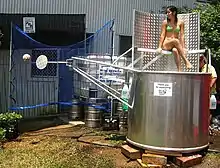 A dunk tank, also known as a dunking booth or dunking machine, is an attraction mainly found at fairs, fundraisers, and parties. It consists of a large tank of water over which a volunteer sits on a collapsing seat. When a ball strikes a target, the seat collapses, "dunking" the person into the water.[1] People will often volunteer to get dunked fully clothed for a humorous effect.