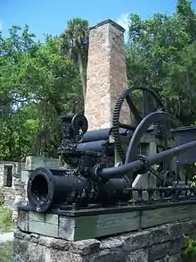 The remains of the sugar mill include the ruins of coquina block and brick structures, and an assortment of sugar processing equipment including the gear mechanisms of the rolling sugar cane press, the iron boiling kettles, and the steam furnace and piston mechanisms used in operating the cane press. This assembly is one of the earliest extant examples in the United States of the machinery required to produce sugar, molasses, and rum.